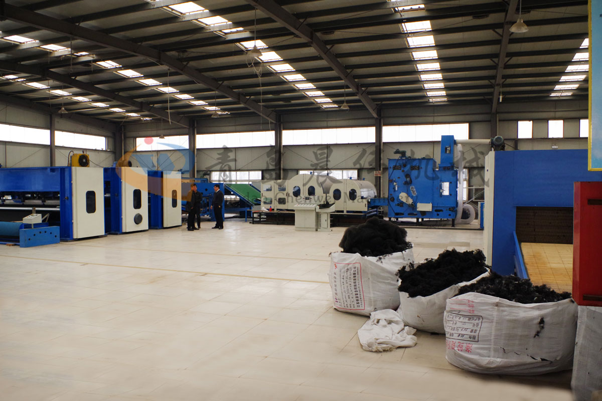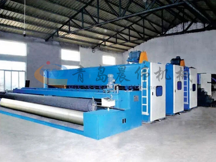開(kāi)包機(jī)-開(kāi)松機(jī)-振動(dòng)給棉機(jī)-梳理機(jī)-鋪網(wǎng)機(jī)-針刺機(jī)-切邊成卷機(jī)