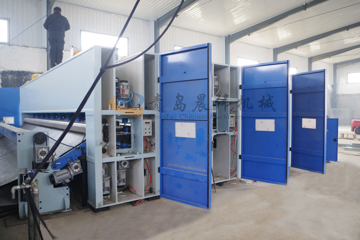 5. CWPW-鋪網(wǎng)機(jī):用于將梳理纖網(wǎng)通過移動(dòng)小車交叉折疊為所需幅寬和定量的多層纖網(wǎng),以供后道工序使用。鋪網(wǎng)輥采用特殊結(jié)構(gòu),加裝壓網(wǎng)輥和導(dǎo)流板,不飄網(wǎng)不起皺,五只大功率電機(jī)精確控制各部件的運(yùn)動(dòng),電動(dòng)輸出簾高度調(diào)節(jié)裝置