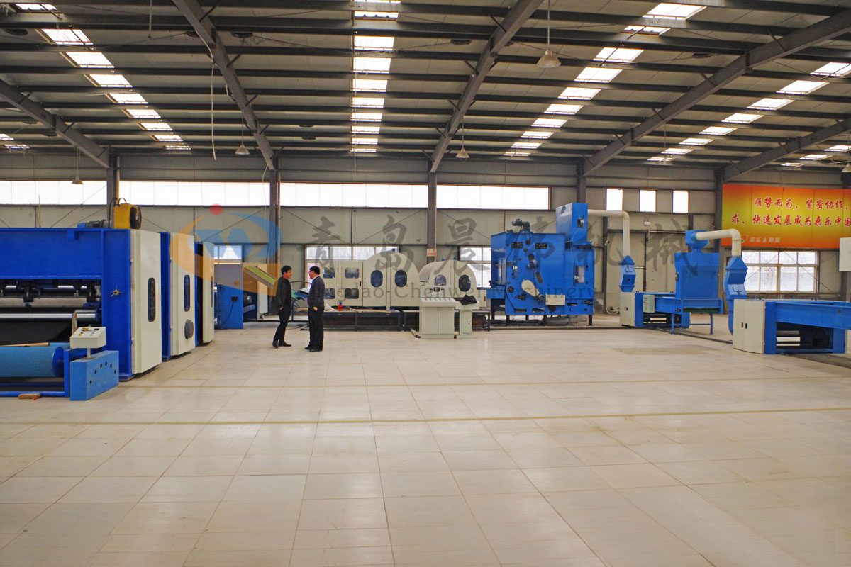 開(kāi)包機(jī)-開(kāi)松機(jī)-振動(dòng)給棉機(jī)-梳理機(jī)-鋪網(wǎng)機(jī)-針刺機(jī)-切邊成卷機(jī)